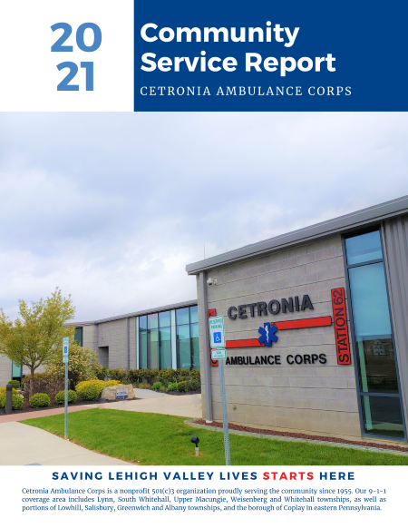 Cetronia Ambulance Corps has published its 2021 Community Service Report and we’d like to share some of our impressive statistics with you. Are you curious about the number and types of calls we do in a year? How about some of the upgrades we have been able to make? Or maybe you just want to learn a little more about our history! We invite you to peruse our 2021 Community Service Report to find out all these answers, and more. We’d love your feedback on it.
