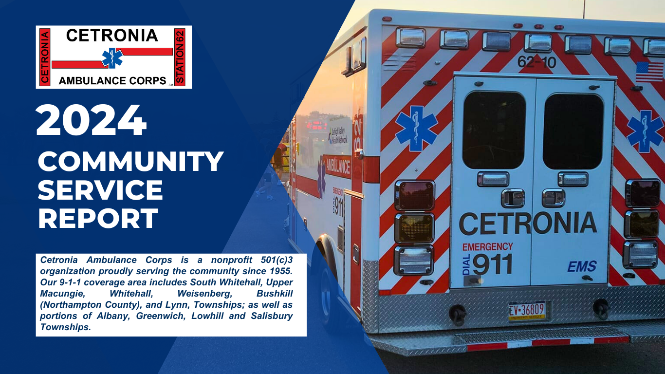 Cetronia Ambulance Corps is proud to share its 2024 Community Service Report, highlighting some of our impressive statistics. If you have any questions about the report, we encourage you to reach out to us.