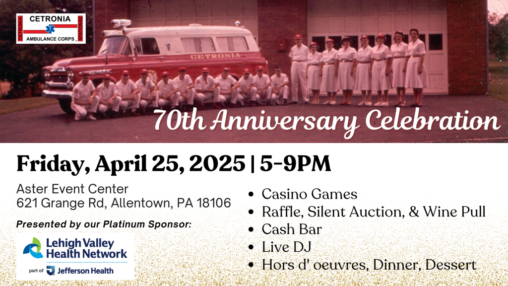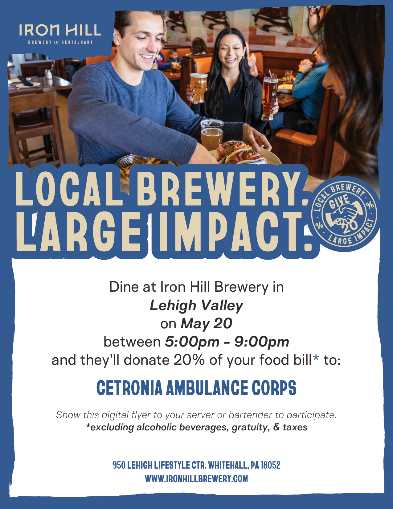 Support Cetronia Ambulance Corps during EMS Week for a dine & donate fundraiser! On Tuesday, May 20, 2025, from 5-9 PM, Iron Hill Brewery & Restaurant (950 Lehigh Lifestyle Center, Whitehall, PA 18052) will donate 20% of your bill to our cause! Simply show this flyer or let your server know you’re supporting the fundraiser.
